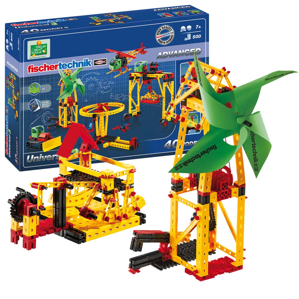 Vehicles with steering, bulldozer with tracks, crane with cable winch, and windmill with reduction gear allow children a fascinating glimpse into the world of technology while playing.