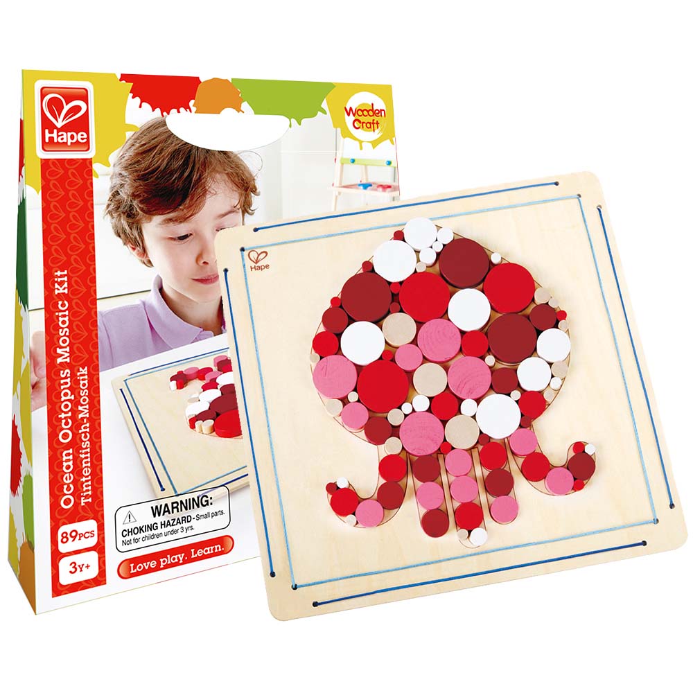 Colourful, wooden circles, a patterned base and string for framing let you create your own octopus mosaic.