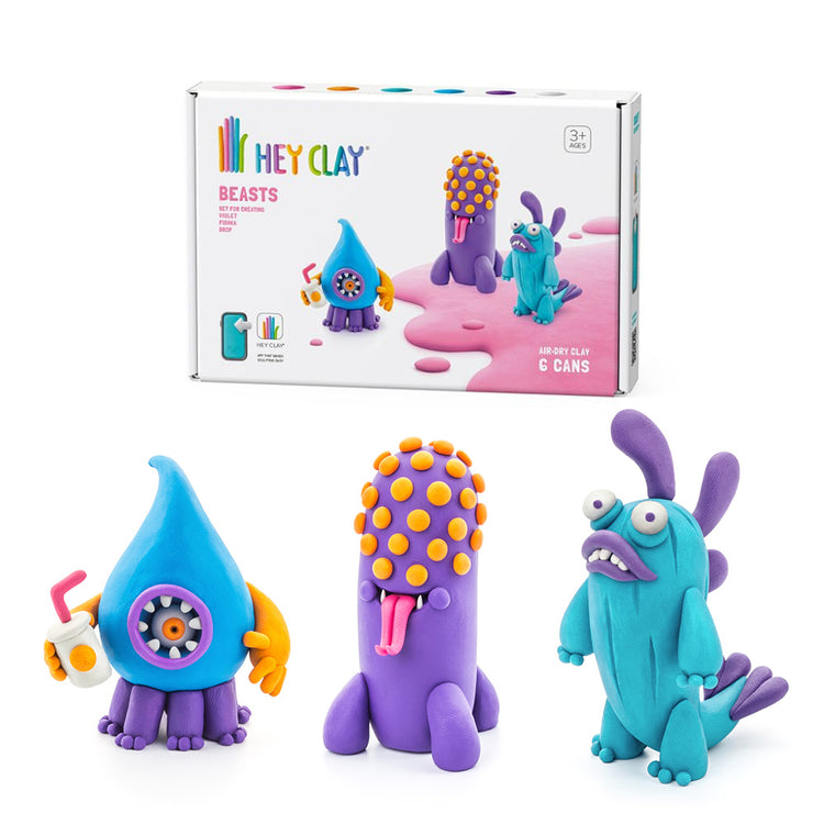 Hey Clay: Modelling Air-Dry Clay with Fun Interactive App - Beasts, 6 Cans: Beasts Series: Drop, Violet, Fishka