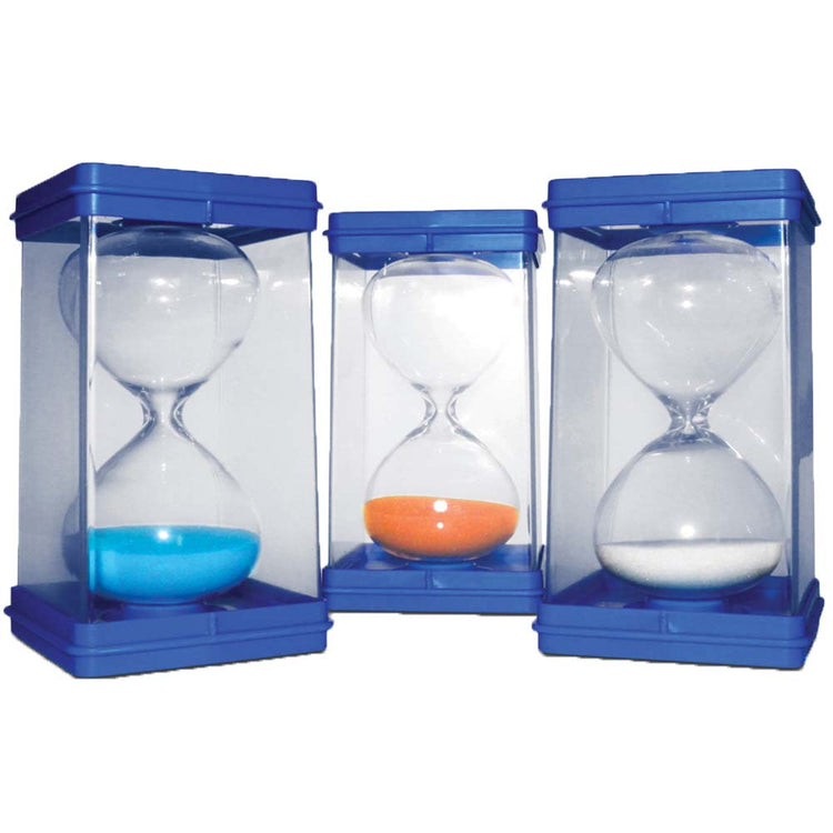Designed with an 80mm square base and top to prevent rolling, each sand timer has the time embossed on the top and colour-coded grains.