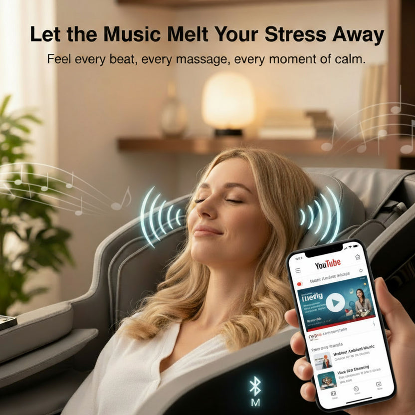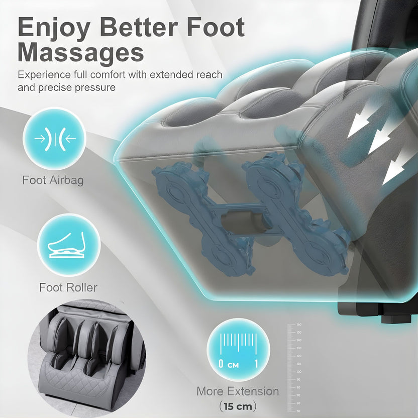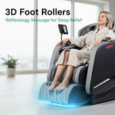 Foot rollers massage under the feet while airbags hold the lower legs.