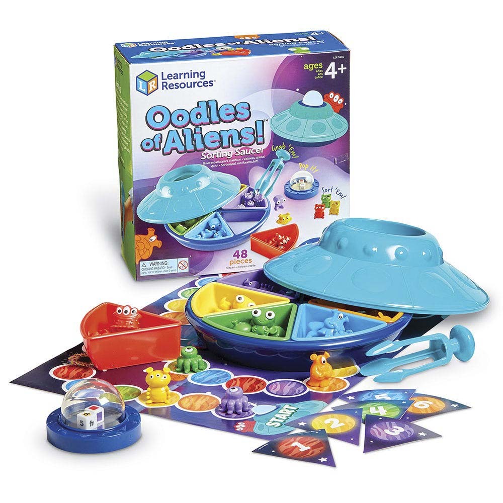 Turn sorting into an out-of-this-world game using this 2-piece spaceship with sorting trays, popper top with colour and number dice, Tri-Grip Tong and 30 colourful squishy alien counters.