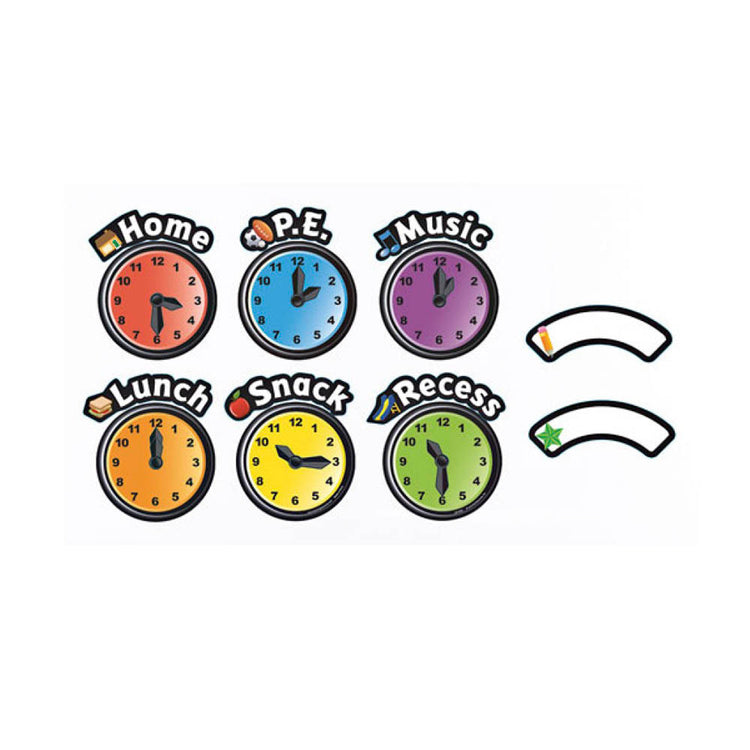 Learning Resources Magnetic Daily Schedule Clocks. Display a fun and interactive daily schedule and practise time telling simultaneously! Magnetic clocks come with interchangeable hands and labels to provide structure to a day: snack, recess, lunch, PE, music, home and two customisable blanks.