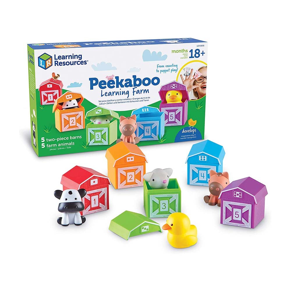 Learning Resources Peekaboo Learning Farm helps children build counting, colour, matching, and sorting skills during every imaginative adventure with the farm friends. Each of the set's five numbered two-piece barns comes in a different vibrant colour, including red, orange, blue, green, and purple. Each barn also pops open to reveal different animal finger - the set's friendly cow, pig, chicken, and more.