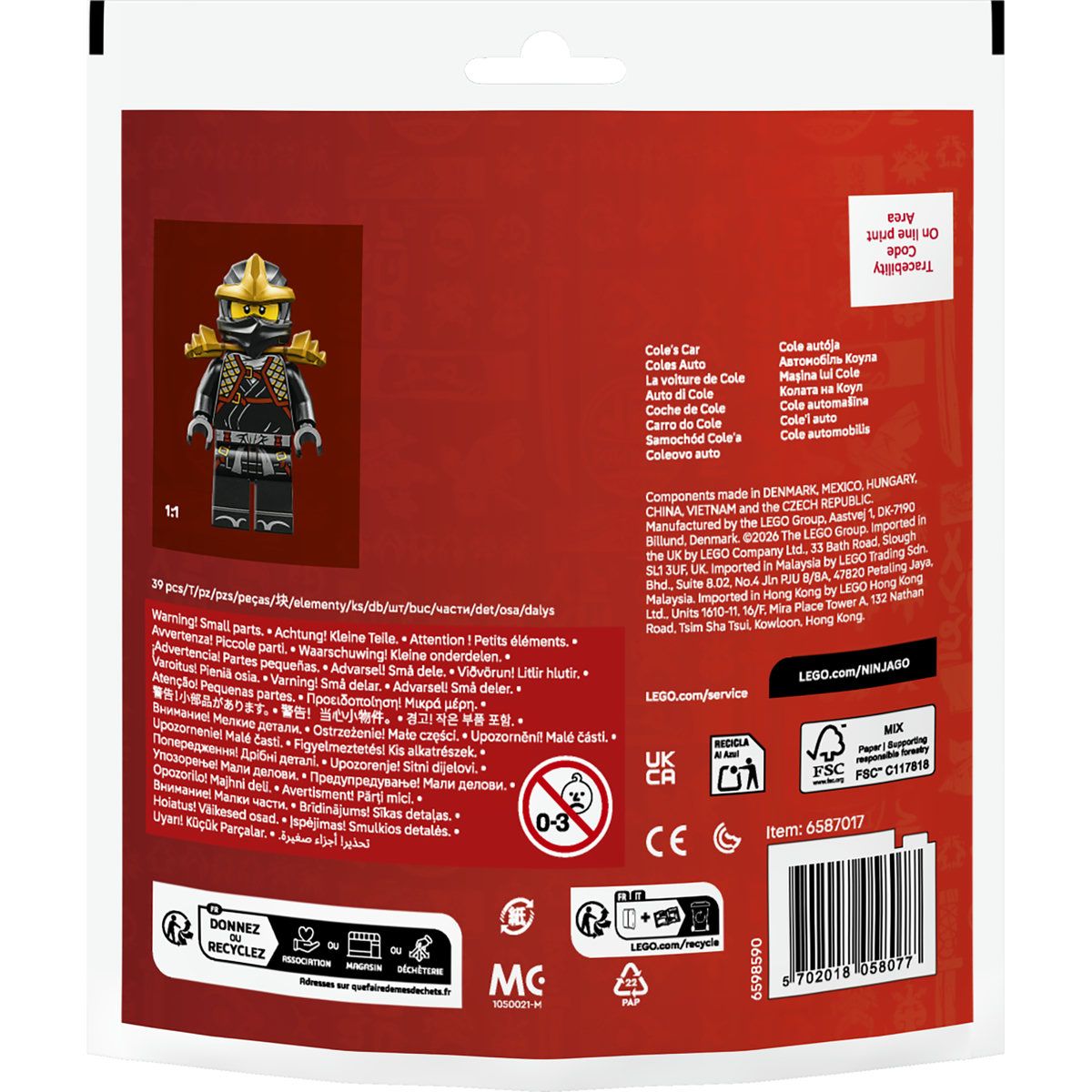 Kids aged 6 and over can play out driving action with a mini version of a supercool ninja car driven by a Cole minifigure armed with a golden sword._