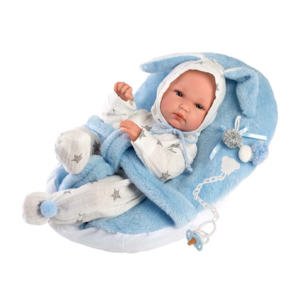 Bimbo wears a white onesie with grey stars and comes with a beautiful blue baby carrier seat! He's as cute as a button!