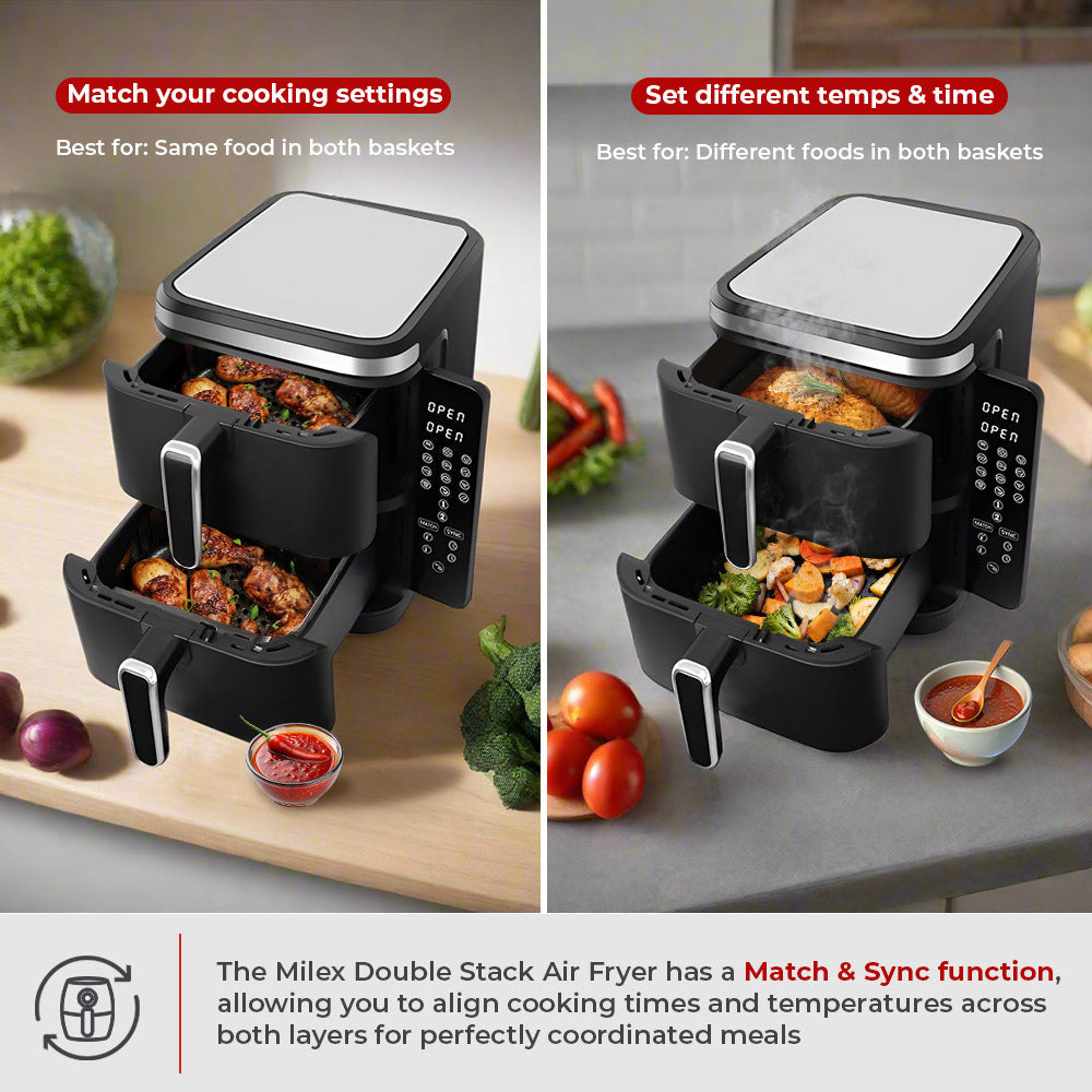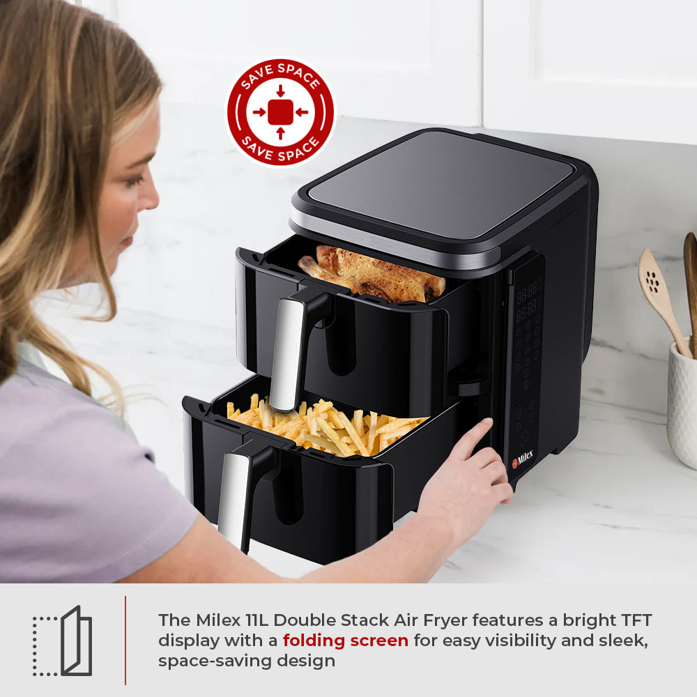 Enjoy the convenience of faster, healthier cooking with the Milex 11L Double Stack Air Fryer – where innovation meets taste! 🍽✨