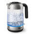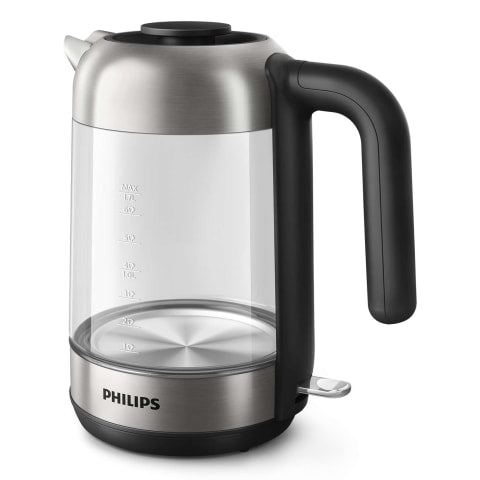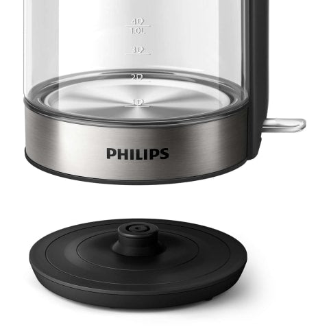 - 1 cup indicator to boil only the water you need This family size glass kettle is stylish and modern, while still being functional and made to last. The intuitive blue light indicator inside the base illuminates the water when switched on, and the cordless operation allows for easy pouring. About Philips