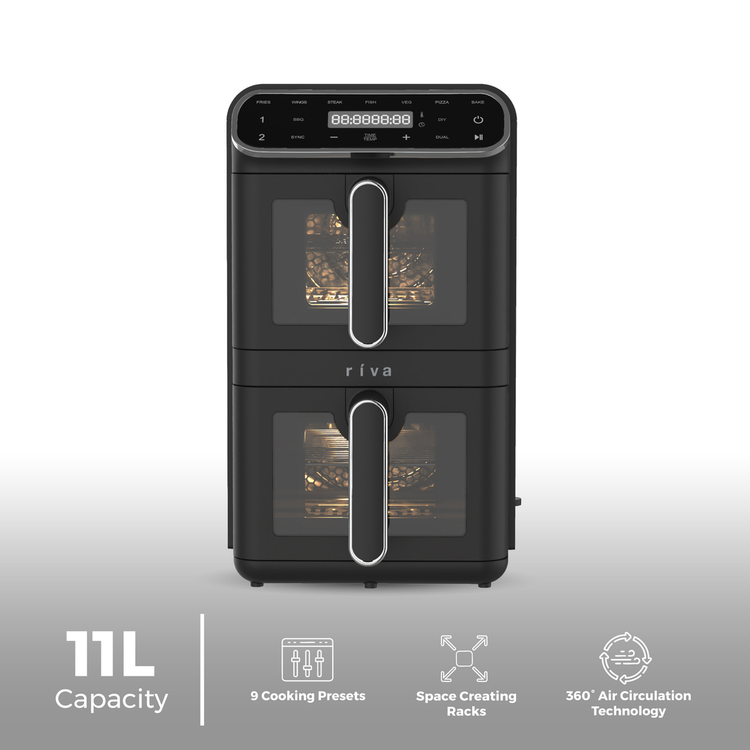 From crispy fries and golden wings to fresh vegetables and tender steaks, the dual-basket design lets you cook more, faster, and healthier. Stylish stainless accents, versatile presets, and hassle-free cleanup make the ríva 11L Level Up Vertical Air Fryer a seamless addition to your kitchen and lifestyle.