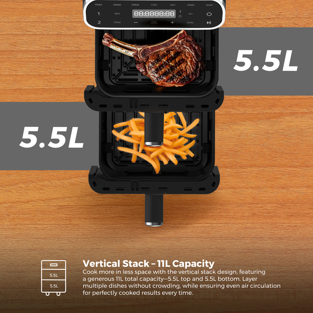 - 11L XL capacity (2 x 5.5L independent cooking zones)