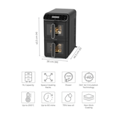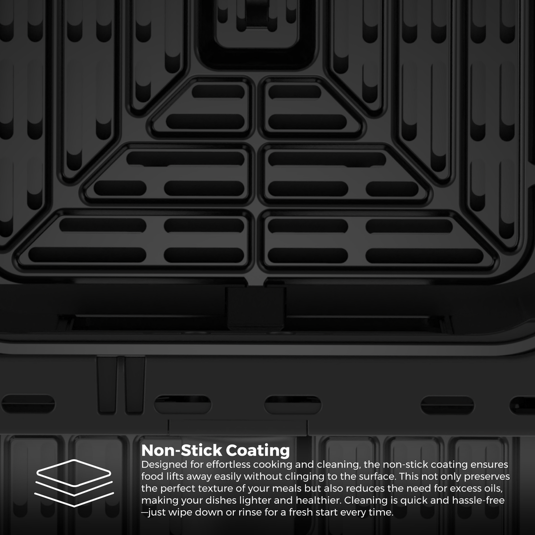 With two independent 5.5L baskets, you can prepare different dishes at the same time, saving time without compromising on taste. Choose from 9 convenient preset functions or set your own temperature (60°C–200°C) for precise, customizable results. The included racks expand cooking capacity, while non-stick, dishwasher-safe baskets and trays make cleanup effortless. Safety and convenience are built in with a 60-minute timer and overheat protection.
