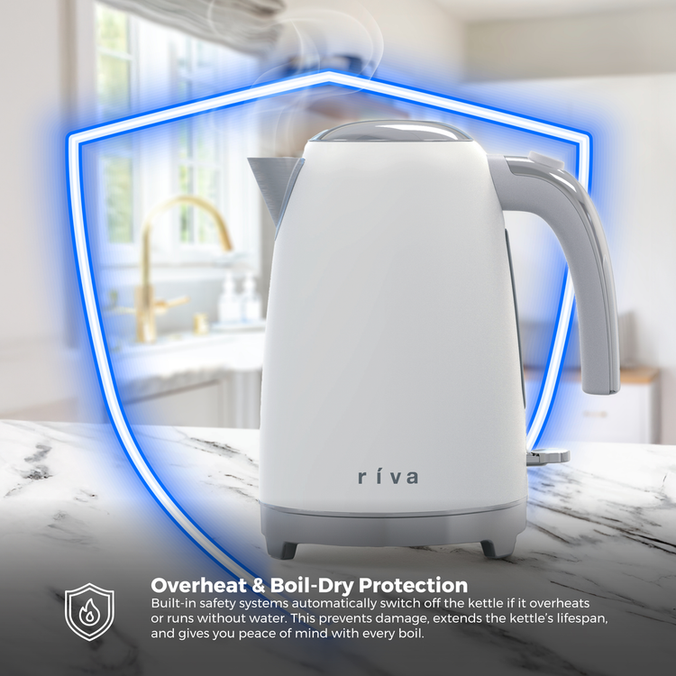 Introducing the rĂva 2200W Brushed Stainless Steel Electric Kettle â a sleek, high-performance essential for every kitchen. With 1.7L capacity, brushed stainless steel design, and a Strix Technology control, it delivers safe and efficient boiling. The 360° cordless base and ergonomic open handle ensure easy pouring, while the integrated water window lets you monitor the fill level at a glance. For added convenience, the soft touch auto lid release, boil dry and overheat protection, concealed heating element, integrated cord storage and removable filter, make every brew effortless.