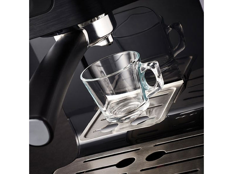 - The drop-down drip tray allows you to use either small espresso cups or tall latte cups.