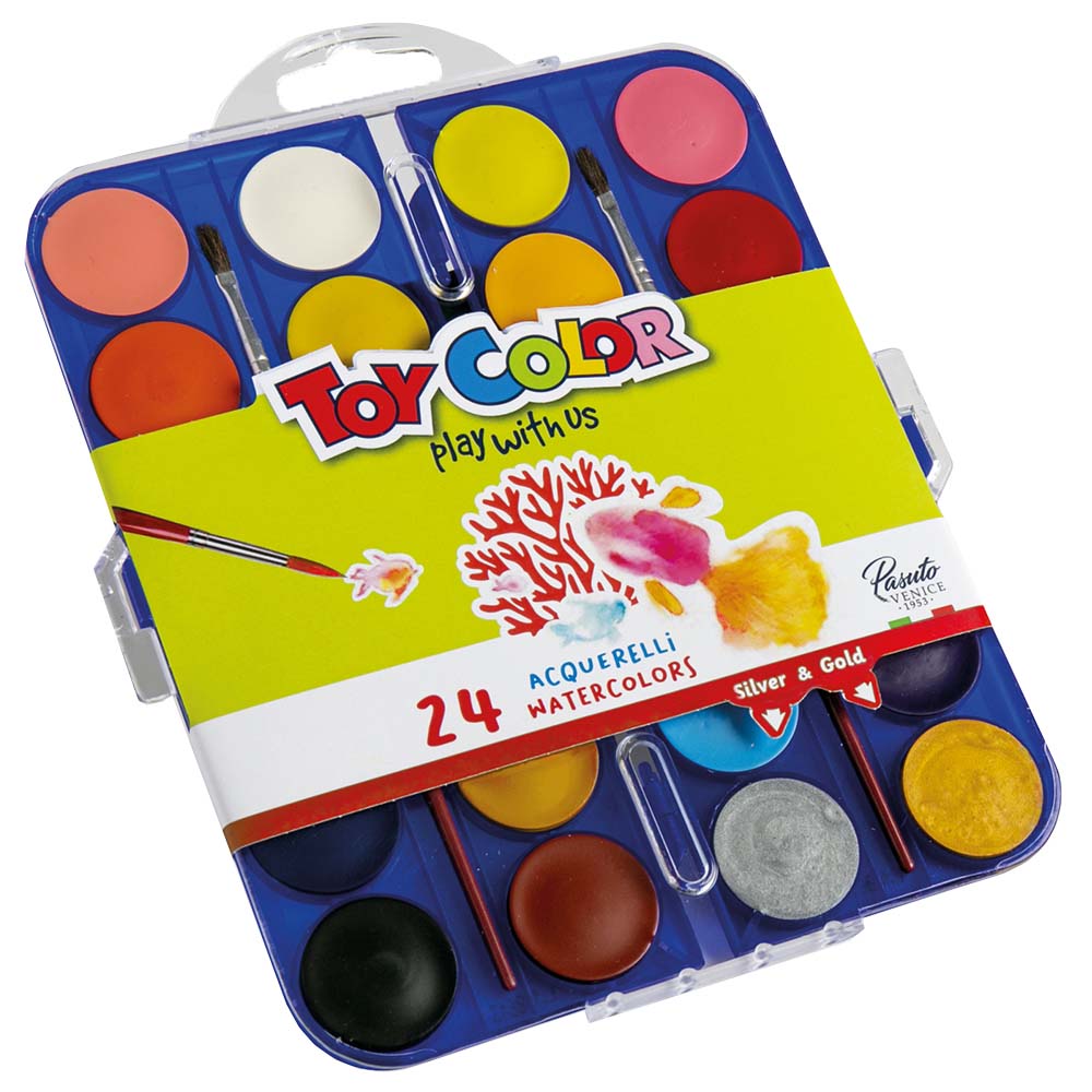Toy Color - Watercolours - 22 Tablet, 2 Metallic & 2 Brushes - 30mm Diameter Container